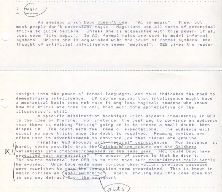 Finally, GEB abounds with “magical” coincidences. For instance, it hardly seems possible that the Goldbach conjecture and the Goldberg Variations were proposed/composed in the same year. How could Doug have predicted such serendipity? The answer of course is that he didn’t. The source material for GEB is so rich that such coincidences could hardly be avoided. Once Doug made some curious observation, previous passages were rewritten to make the connection seem preordained. This is known in magic circles as “goal switching”.5 Again, knowing how it’s done does not in any way detract from the enjoyment.